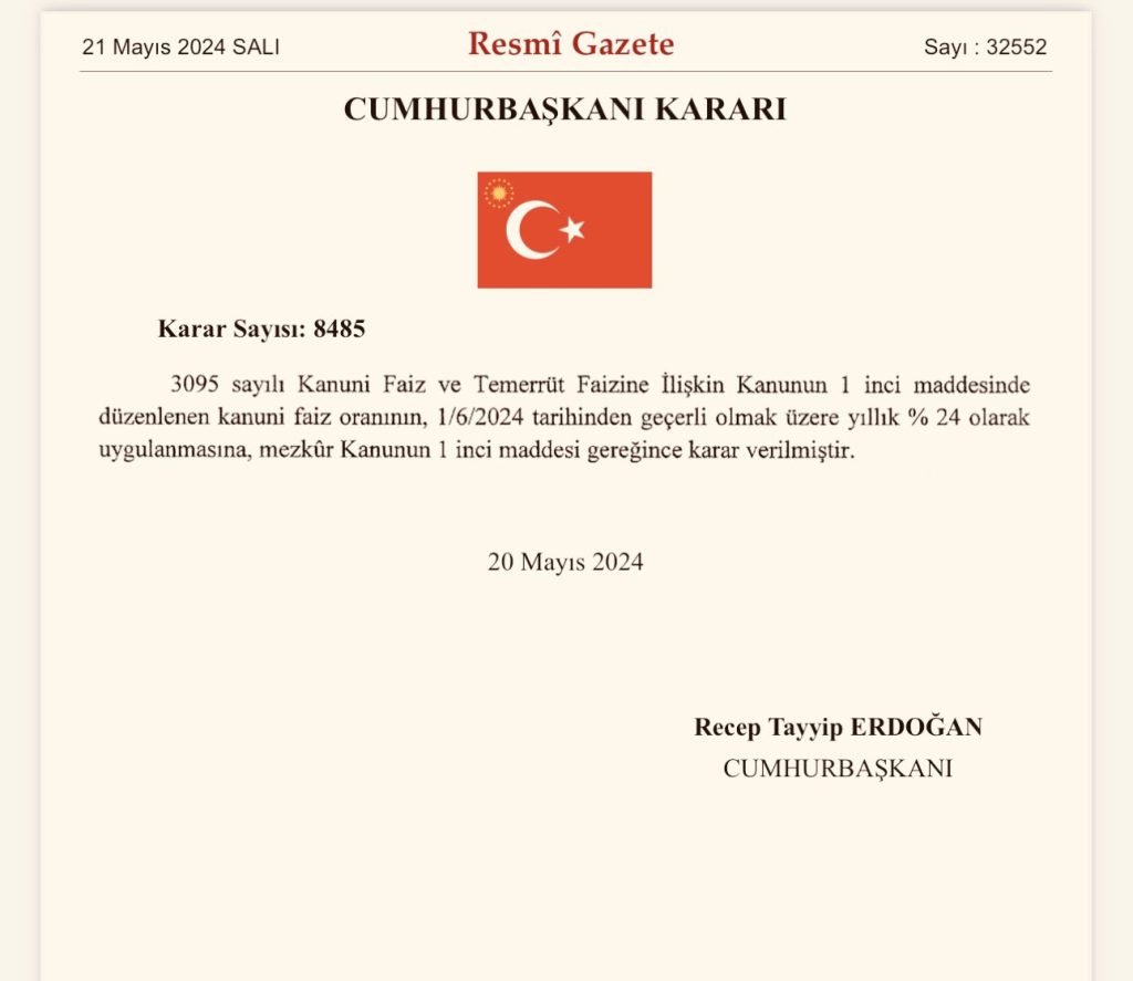 Türkiye’de yasal faiz oranı %9 gibi ekonomik gerçekliğe uygun olmayacak derece düşüktü. 20 Mayıs 2024 tarihli Cumhurbaşkanı Kararı ile bu oran 01.06.2024 tarihinden itibaren geçerli olmak üzere %24’e yükseltildi.